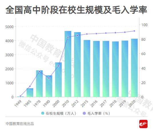 1949年,中國高中在校學生數量為32萬人,毛入學率僅為1.1%。到1965年,高中在校學生規模升至613萬人 ,毛入學率14.6%。2000年,全國高中階段教育共有在校學生2447萬人,毛入學率42.8%。之后我國高中階段教育快速發展,2010年在校學生數升至4677萬人,毛入學率也加速提升至82.5%。