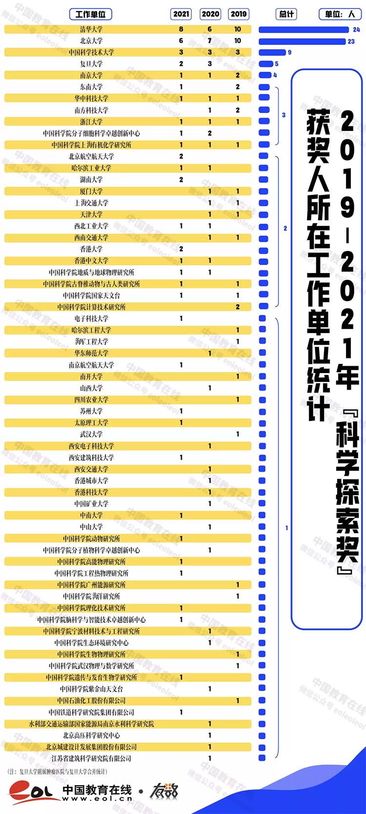 從三年的獲獎名單來看,高校共有116人獲獎,清華大學、北京大學的獲獎人數最多,分別有24位、23位科學家獲獎,其次,中國科學技術大學有9位科學家獲此殊榮。