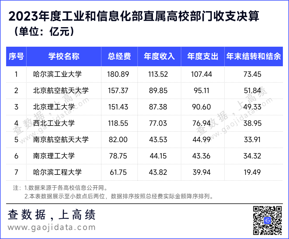 8月14日查詢各高校官網發現,7所工業和信息化部直屬高校已公布2023年度的部門收支決算。