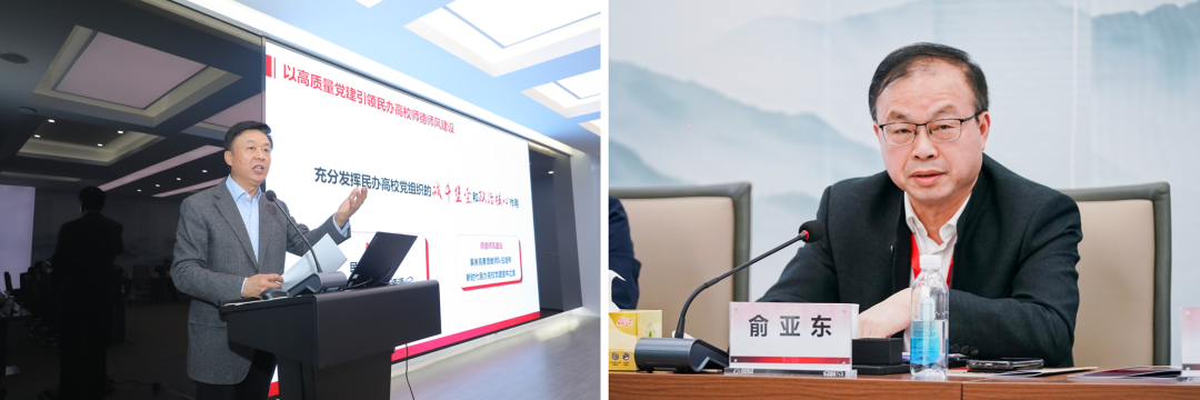 教育部思政課總教指委主任、民辦高校思政課分教指委主任楊曉慧,中國民辦教育協會黨建專委會理事長俞亞東講話