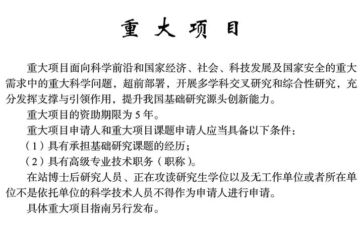 2. 上年度獲得面上項目、重點項目、重大項目、重大研究計劃項目(不包括集成項目和戰略研究項目)、聯合基金項目(指同一名稱聯合基金)、地區科學基金項目資助的項目負責人,本年度不得作為申請人申請同類型項目。