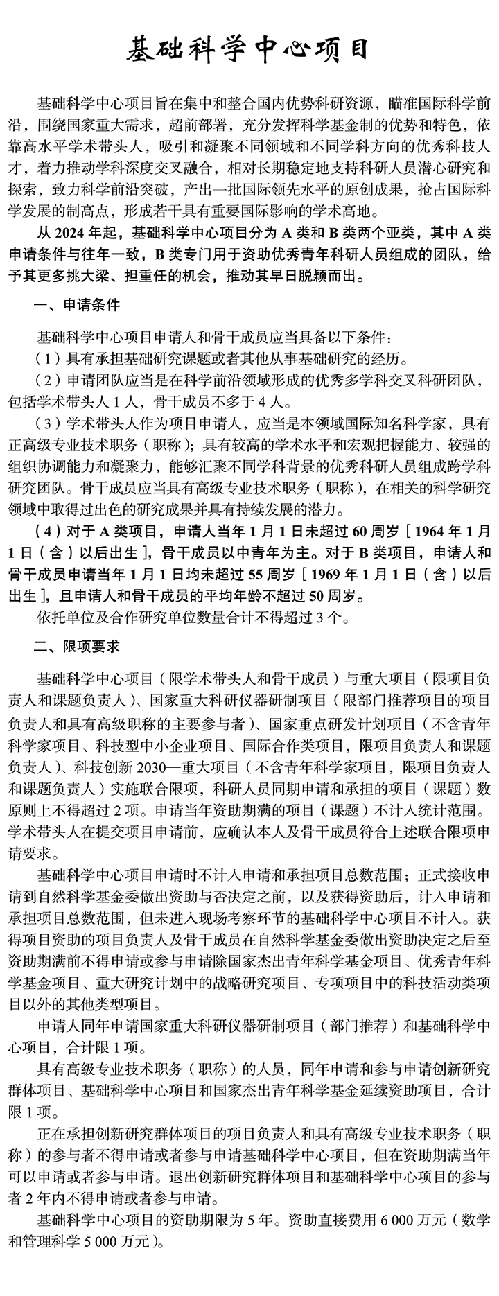 《2024年度國家自然科學基金項目指南》申請規定