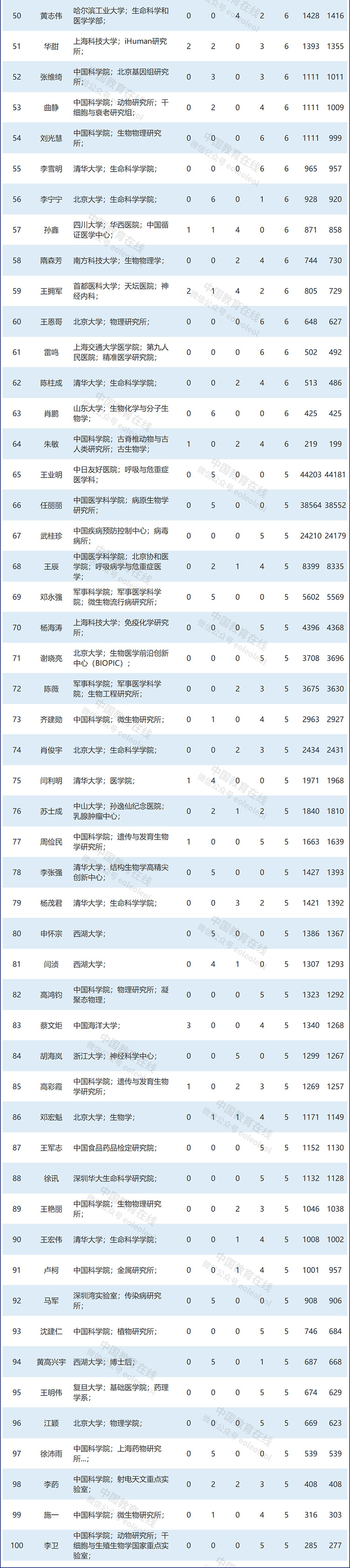 施一公第一、顏寧第二!2014-2023七大頂刊中國學者排行榜TOP100出爐