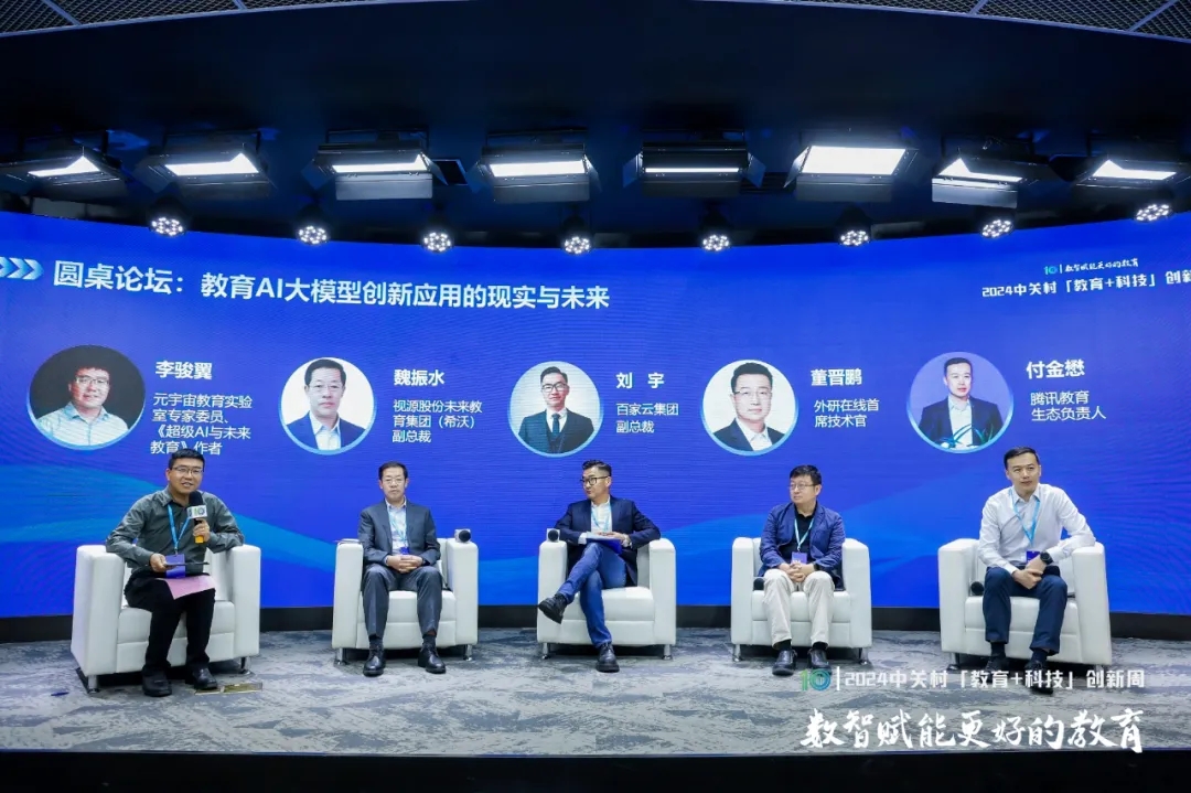 在“教育AI大模型創新應用的現實與未來”圓桌論壇環節,視源股份未來教育集團(希沃)副總裁魏振水,百家云集團副總裁劉宇,外研在線首席技術官董晉鵬,騰訊教育生態負責人付金懋分別就教育大模型的應用、教育大模型的核心特點與未來發展趨勢、教育生態服務者的責任等一系列問題展開探討。在“百模大戰”的時代背景下,教育專屬大模型的應用與實踐始終是行業關注的重點。面向未來,教育大模型應進一步保障數據的時效性、合規性和安全性,助力個性化學習和因材施教,促進拔尖創新人才培養。教育科技產品的研發和應用要緊跟國家政策引導,政產學研用深度協同,推進教育、科技、人才“三位一體”協同融合發展。元宇宙教育實驗室專家委員,《超級AI與未來教育》作者李駿翼主持圓桌論壇。
