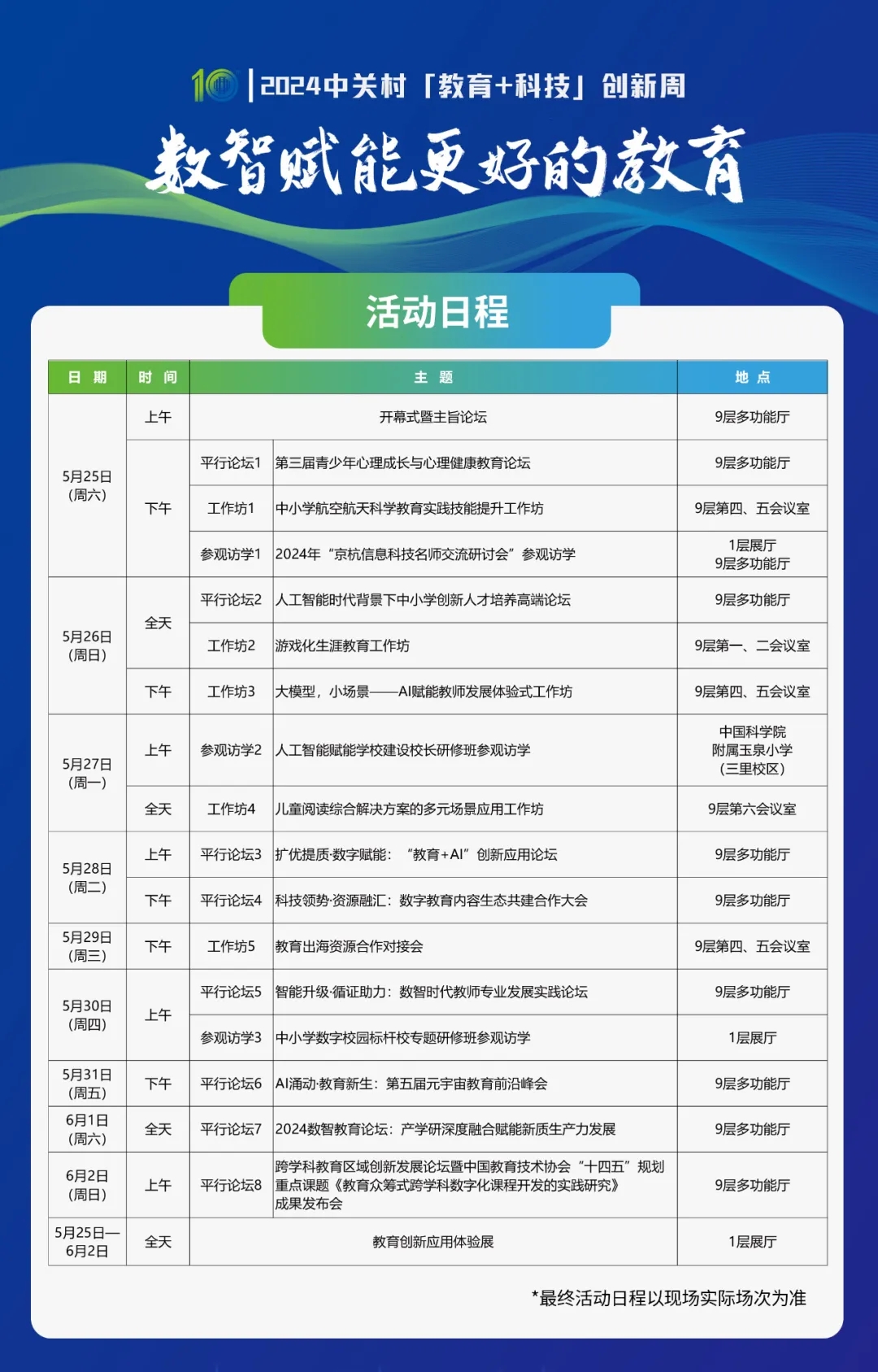 活動將從5月25日至6月2日持續舉辦,活動形式包括開幕式暨主旨論壇、平行論壇、教育工作坊、參觀訪學、教育創新應用體驗展等,內容涵蓋人工智能教育應用、學校育人模式創新、數字教育內容建設、青少年心理健康、教師數字素養提升、產教融合發展等話題。