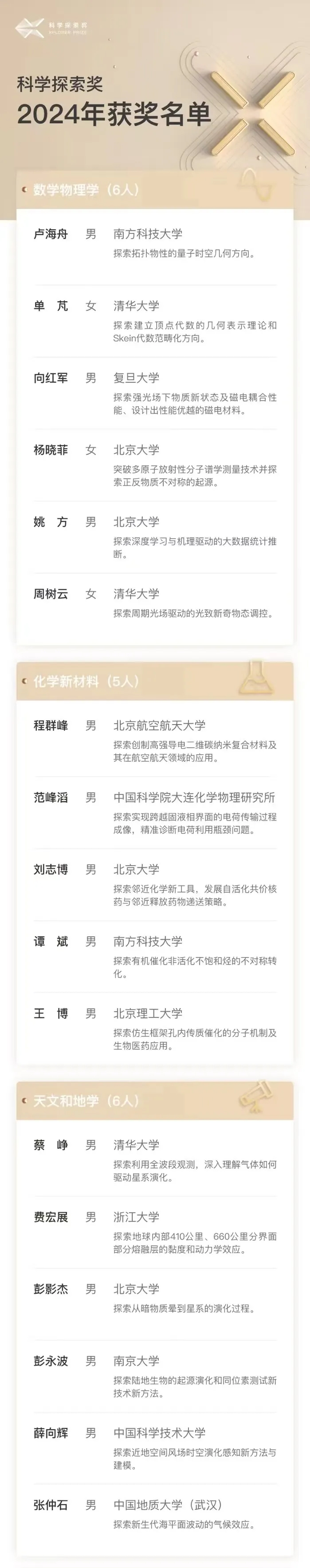 2024年“科學探索獎”設置10個領域,包括數學物理學、化學新材料、天文和地學、生命科學、醫學科學、信息電子、能源環境、先進制造、交通建筑、前沿交叉。每位獲獎人在5年內獲得總計300萬元人民幣獎金,且可自由支配。
