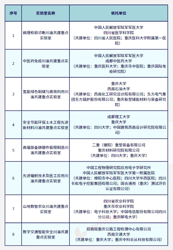 擬新建川渝共建重點實驗室名單如下: