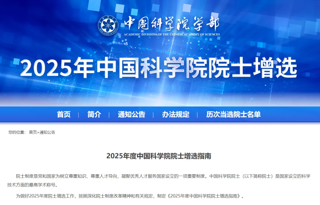 為做好2025年度院士增選工作,按照深化院士制度改革精神和有關規定,制定《2025年度中國科學院院士增選指南》。