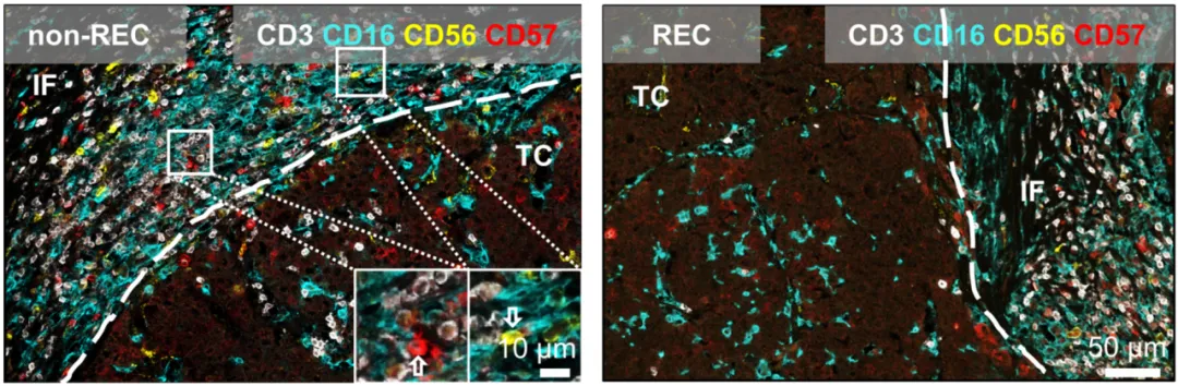 非復發(non-REC)和復發(REC)組織中的多色免疫組化染色。與復發肝癌相比,非復發肝癌患者的腫瘤侵襲前緣區域(invasive front)NK細胞更為豐富。